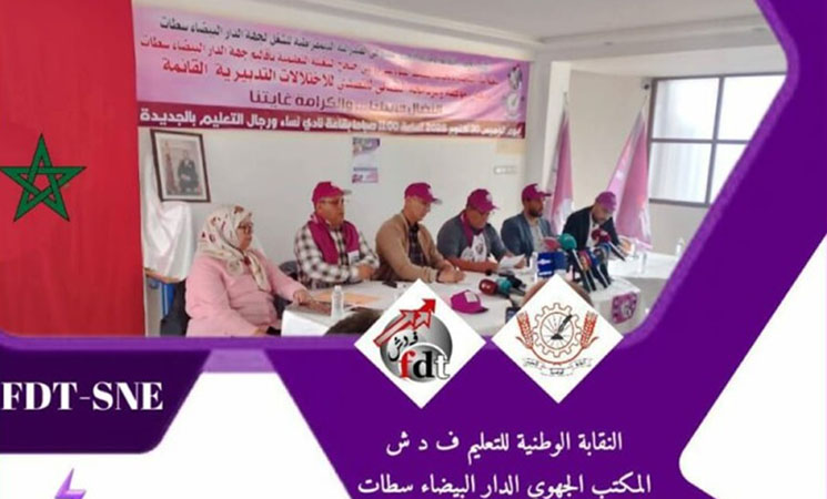 وقد جاء الإعلان عن هذه الخطوة النضالية، أثناء الندوة الصحفية التي عقدها المكتب النقابي بالجديدة، قصد بسط وتوضيح المشاكل والاختلالات التي تتخبط فيها الأكاديمية وبعض المديريات الإقليمية في ظل غياب تحمل المسؤولية والمحاسبة، الأمر الذي جعل المنظومة برمتها تنحى إلى الفشل السريع. وعرفت الندوة الصحفية حضورا مكثفا لممثلي المنابر الإعلامية على اختلاف أصنافها (مرئية ومسموعة ومكتوبة وإلكترونية …) إلى جانب عدد من نساء ورجال التعليم الذين يتحملون المسؤولية النقابية على المستوى المحلي والإقليمي وكذا الجهوي.